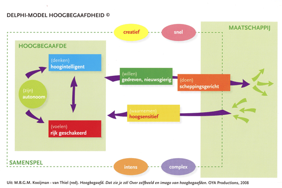 Het vinden van passende taal om met anderen te praten, zonder direct de term hoogbegaafdheid te hoeven gebruiken, kan soms lastig zijn. Het Delphi-model Hoogbegaafdheid (Kooijman-Van Thiel, 2008) kan hierbij uitkomst bieden, en een hulpmiddel zijn voor alle leeftijdsgroepen van jong tot oud. Het model is opgebouwd uit woorden die je kunt gebruiken om te beschrijven hoe hoogbegaafdheid er bij jou uitziet om daarmee een ander inzicht te geven in wat het voor jou persoonlijk betekent. Dit model gaat niet uit van prestaties, maar van de innerlijke beleving en bestaat uit zes elementen met daaraan verbonden kenschetsen: ‘zijn’ (autonoom), ‘denken’ (hoogintelligent), ‘voelen’ (rijkgeschakeerd), ‘willen’ (gedreven en nieuwsgierig), ‘doen’ (scheppingsgericht) en ‘waarnemen’ (hoogsensitief).